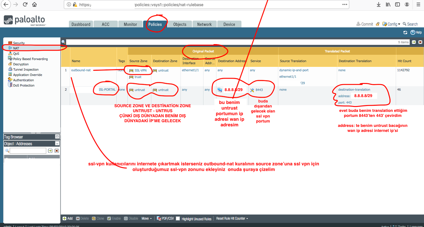 • evet şimdi NAT’ımızı aşağıdaki gibi yapacağız yukarıdaki yaptığım config’te portal ve ssl vpn connect bağlantılarımı 443’te 8443’e çektiğim için policy ve natlarda portlarımı değiştirmem gerekiyor,