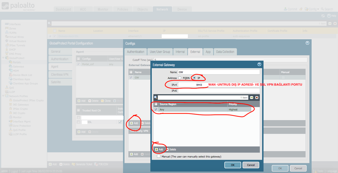 yukarıdaki ve aşağıdaki ekran görütüsünde External benim untrus bacağımdaki wan ip adresime gelecek diyorum ve 8443 portu ile ssl-vpn bağlantısı kurulaca aynı zamanda globalprotect portalınada 8443 portu ile bağlanacak yani ssl vpn ile ilgili portum 8443 opsiyonel olarak değiştirilebilir, defaultta bırakılır ise 443 palo alto web mgmt portu ile’de çakışır