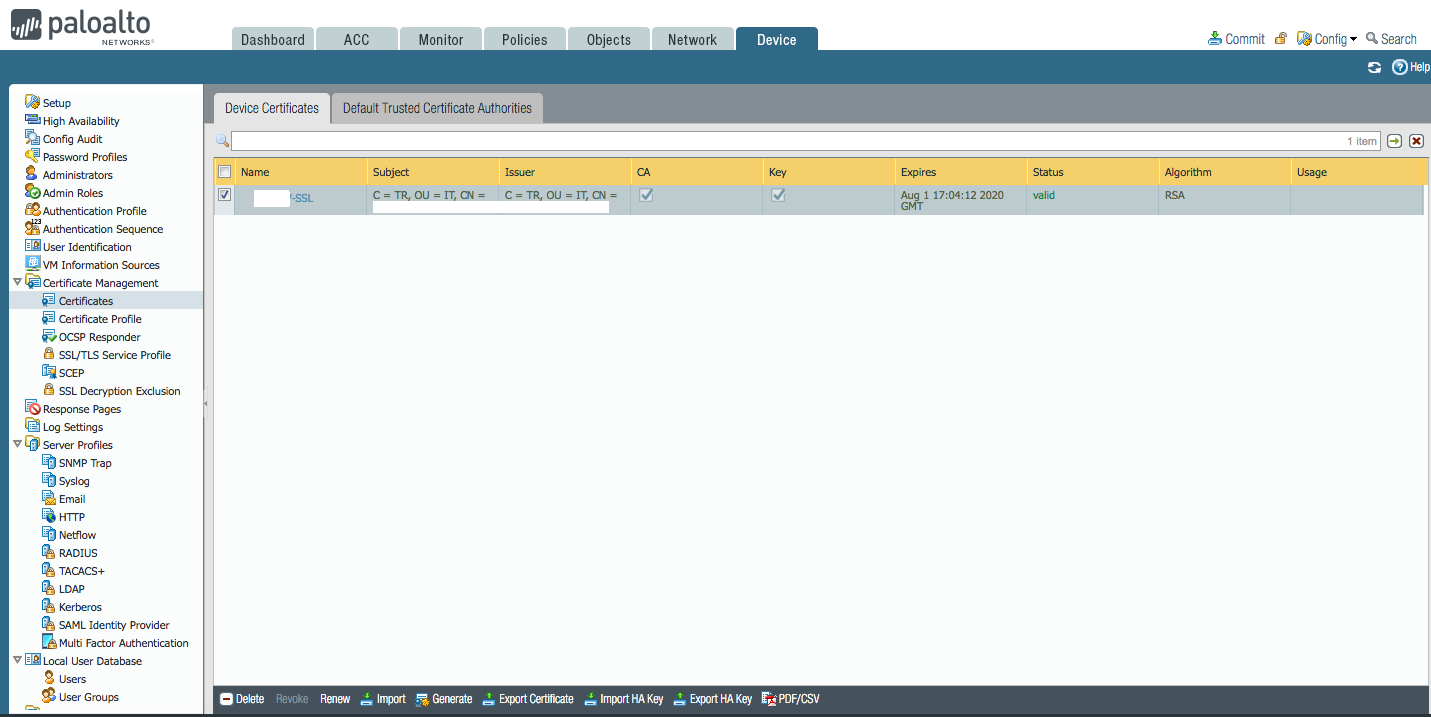 yalnız palo altoda şöyle bir şey var oluşturduğunuz hiçbir sertifika süresini 1 yıldan uzun yapamıyorsunuz her yıl yenilemek zorundasınız sanırım güvenlikten dolayı sertifika yıl olayını kısıtlamış kullanıcıya müdahale ettirmiyorlar
