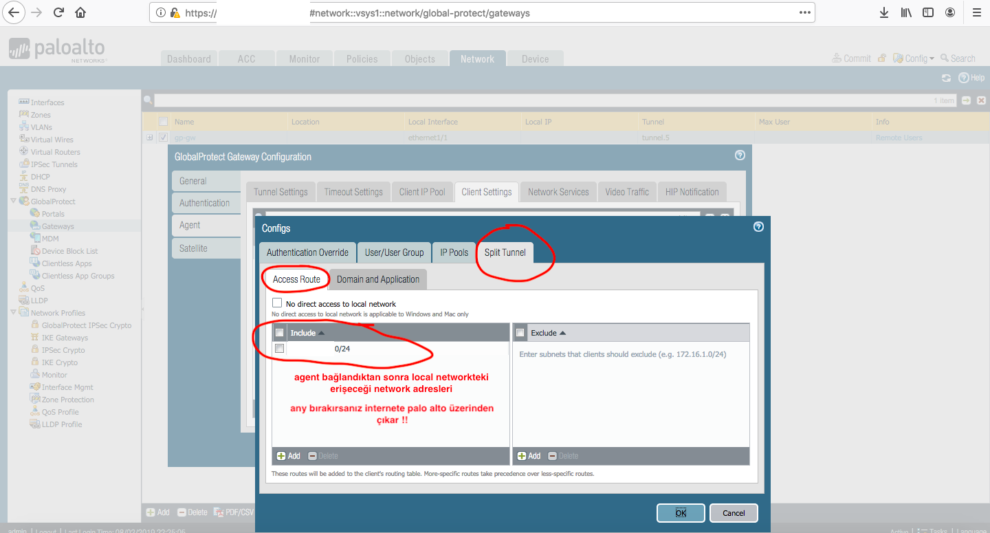 yukarıdaki görüntüde Access route’da any olarak bırakırsanız ssl vpn ile bağlananlar internete palo alto üzerinden çıkacak yani FULL TUNNEL olarak çalışacak