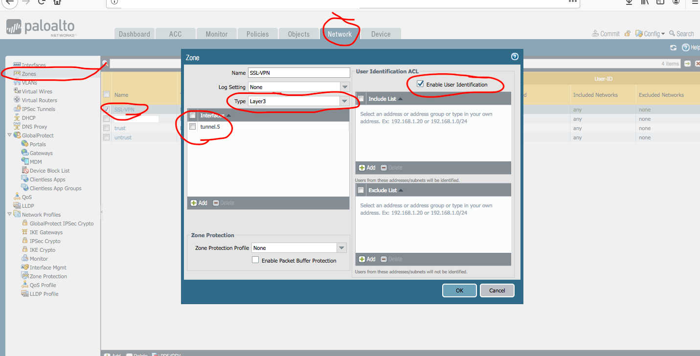 yukarıda Type Layer3 OLMALI- interface (ssl vpn için oluşturduğunuz interface ekleyin) User Identification ACL( enable user Identification) sekmesini işaretleyin bu sekme hangi kullanıların ACL kuralına tabi olacakları anlamına gelir ACL buradan yapmıyoruz bu sadece policy tarafını ayırmamız için bir zone