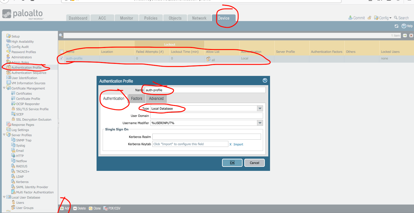 yukarıda Authentication-Type Local database seçiyoruz (domain veya Ldap authentication kullanmıyorsanır- kullanıcıları domanin controller’dan çekmiyorsanız eğer dc üzerideyse ldap veya ad seçiyorsunuz, Local Database palo alto üzerinde oluşturduğum kullanıcılar ile authentica ol anlamını taşıyor